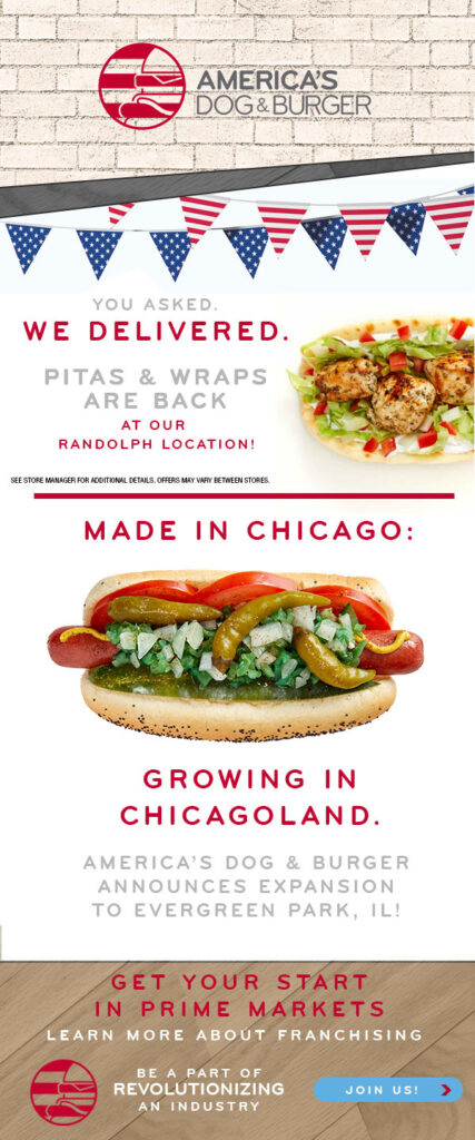 America’s Dog is a hot dog stand and grill with four locations throughout Chicago. They needed help disseminating their messaging and graphics across social, print and email marketing.